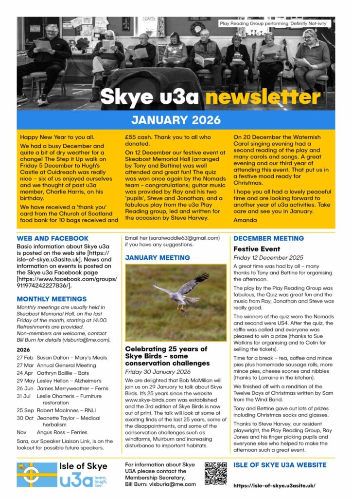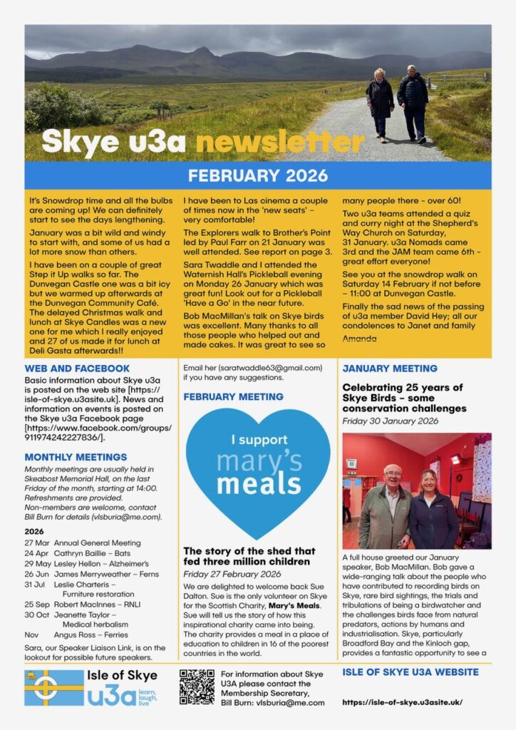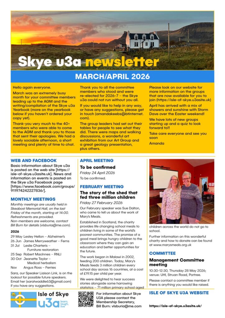 Isle of Skye u3a is one of over 1,000 similar groups throughout the UK which give members the opportunity to share many educational, creative, leisure and social activities. Skye u3a currently has over 100 members and a wide range of activity and interest groups.Membership is open to anyone who is no longer in, or seeking,